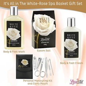 • Our 14 piece spa gift baskets for women include Body & Foot Wash, Body & Foot Cream, Himalayan Bath Soak, Epsom Salt, Soy Candle, Bath Towel, 7pc Nail Kit/Vanity Set, all inside an elegant white reusable Wooden Storage Box.